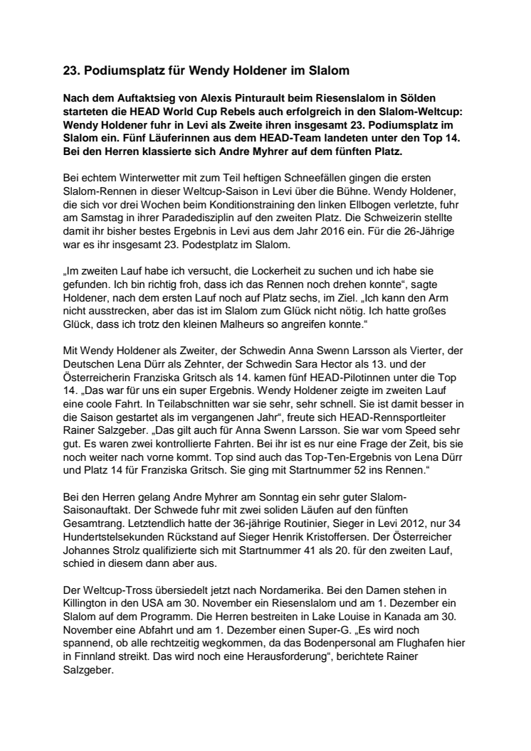Nach dem Auftaktsieg von Alexis Pinturault beim Riesenslalom in Sölden starteten die HEAD World Cup Rebels auch erfolgreich in den Slalom-Weltcup: Wendy Holdener fuhr in Levi als Zweite ihren insgesamt 23. Podiumsplatz im Slalom ein. Fünf Läuferinnen aus dem HEAD-Team landeten unter den Top 14. Bei den Herren klassierte sich Andre Myhrer auf dem fünften Platz.