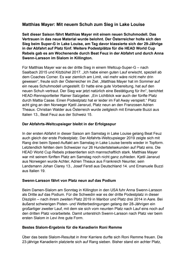 Seit dieser Saison fährt Matthias mit einem neuen Schuhmodell. Das Vertrauen in das neue Material wurde belohnt. Er holte sich den Sieg beim Super-G in Lake Louise, am Tag davor klassierte sich der 29-Jährige in der Abfahrt auf Platz fünf. Weitere Podestplätze für die HEAD World Cup Rebels gab es am Wochenende durch Beat Feuz in der Abfahrt und durch Anna Swenn-Larsson im Slalom in Killington.
