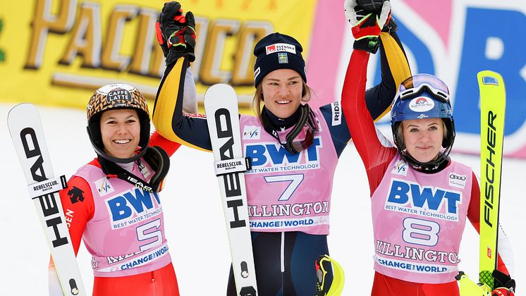 Auf Platz drei landete Riesenslalom-Olympiasiegerin Sara Hector mit zwei Zehntelsekunden Rückstand auf die Siegerin. Die Schwedin ging als Führende in den zweiten Durchgang. Die Norwegerin Ragnhild Mowinckel, Zweite nach Lauf eins, belegte den sechsten Gesamtrang.