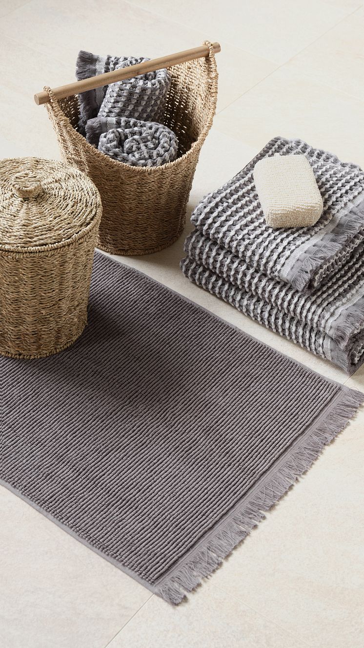 Das Badezimmer schafft eine heitere Gelassenheit mit Produkten wie dem Toilettenbehälter und dem Toilettenpapierhalter VEGBY aus Seegras, die so den organischen Look ins Innere bringen.