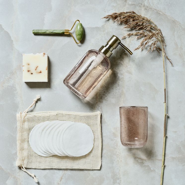 Die verantwortungsvolleren Materialien kommen auch in der ESSVIK-Serie zum Einsatz, wo man Seifenspender und Zahnbürstenhalter aus recyceltem Glas findet oder in den Make-up-Pads VAD aus Bambus und Baumwolle, die im mitgelieferten Baumwollbeutel immer wieder gewaschen werden können.