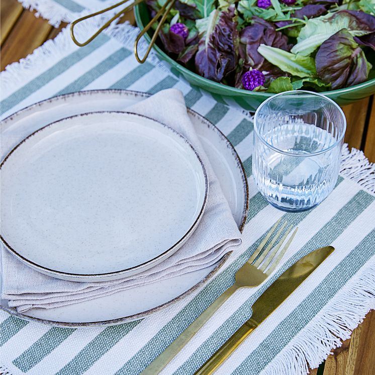 Eine stimmige Ergänzung zu Tischdecken und -läufern sind Tischsets. Die praktischen Alltagsbegleiter schützen vor Flecken und sind gleichzeitig dekorativ. Die Tischsets KUNGSMYNTA und BUKKETORN sind neu bei JYSK. KUNGSMYNTA ist in einer neuen Farbe verfügbar: in einem sanften Beige. Das runde Tischset eignet sich zum Beispiel ideal für gesellige Grillabende, da die Kombination aus KUNGSMYNTA’s Farbe und Muster nicht sommerlicher sein könnten. KUNGSMYNTA hat einen Durchmesser von 38 cm.