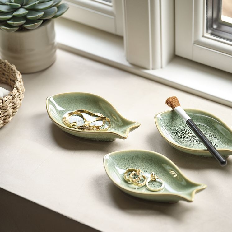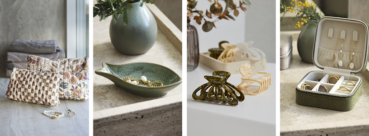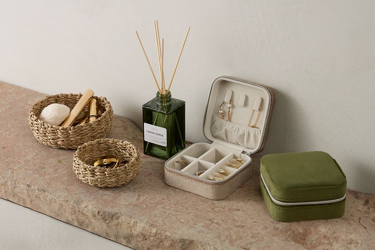 Die aktuellen Badaccessoires von JYSK setzen genau hier an: Accessoires wie die Schmuckschale TIMMELE in Salbeigrün sowie die handgeflochtenen Schmuckschalen KANGOS aus Seegras (2er-Set) bringen nicht nur Ordnung, sondern auch natürliche Akzente ins Bad. Der Kosmetik-Organizer HORNDAL aus Bambus sorgt für Übersicht bei Pflegeprodukten, während das Schmuckkästchen TIDAHOLM aus Velours Schmuckstücke stilvoll aufbewahrt.