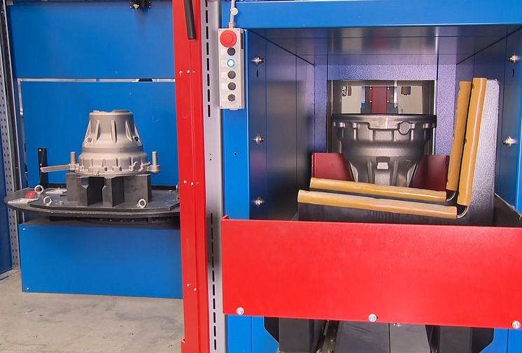 In the GRIND PERFORMER fettling cell, iron castings are inserted without specific fixtures using a rotary ta-ble, fully automatically freed of risers and burrs and then removed at the end – with no reworking required.