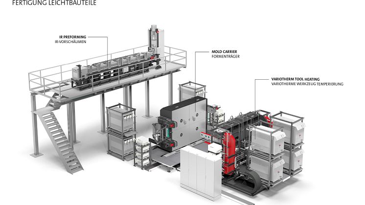 Allerdings verursacht der in herkömmlichen Verfahren verwendete Dampf einen hohen Energieverbrauch lange Trocknungszeiten und verhindert die Integration empfindlicher Einlegeteile. Deshalb entwickelte das weltweit tätige, österreichische Maschinenbau-Unternehmen FILL ein vollelektrisches, völlig dampffreies Herstellungsverfahren für die Partikelschaumverarbeitung. Dabei wird zunächst das Volumen des Mikrogranulates per Infrarot-Strahlung in der patentierten Infrarot-Vorschäumanlage um den Faktor 50 vergrößert.