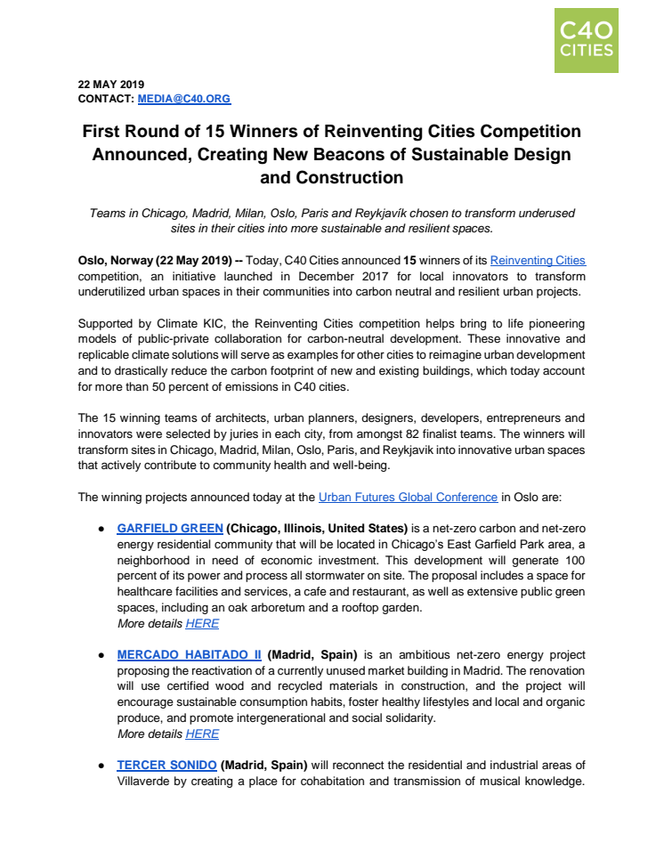 Oslo, Norway (22 May 2019) -- Today, C40 Cities announced 15 winners of its competition, an initiative launched in December 2017 for local innovators to transform underutilized urban spaces in their communities into carbon neutral and resilient urban projects.
