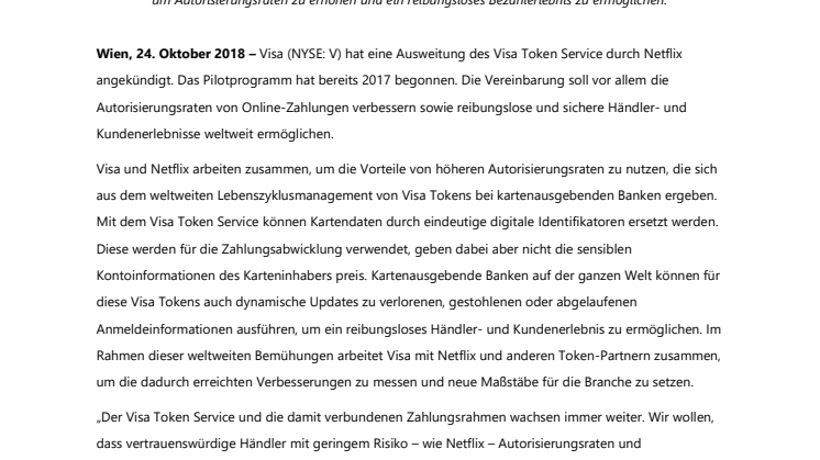 Wien, 24. Oktober 2018 – Visa (NYSE: V) hat eine Ausweitung des Visa Token Service durch Netflix angekündigt. Das Pilotprogramm hat bereits 2017 begonnen. Die Vereinbarung soll vor allem die Autorisierungsraten von Online-Zahlungen verbessernsowie reibungslose und sichere Händler- und Kundenerlebnisse weltweit ermöglichen.