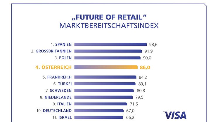 Wien, 3. Februar 2016: Social Media und die Nutzung von Smartphones sind laut einer Studie von Visa Europe Kernelemente für das Einkaufserlebnis der Zukunft. Im Rahmen der Studie wurden zehn europäische Staaten analysiert, um so die Fitness für die veränderten Bedingungen des Handels in den jeweiligen Ländern zu ermitteln. Für den österreichischen Handel wurde nach dem selben Modus der sogenannte Marktbereitschaftsindex berechnet. Mit einem Index von 86 liegt Österreich im europaweiten Spitzenfeld.