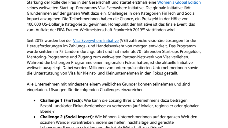 Wien, 08. März 2019 – Zum Weltfrauentag bekräftigt Visa (NYSE: V) sein Engagement für die Stärkung der Rolle der Frau in der Gesellschaft und startet erstmals eine Women’s Global Edition seines weltweiten Start-up-Programms Visa Everywhere Initiative. Die globale Initiative lädt Gründerinnen auf der ganzen Welt dazu ein, Challenges in den Kategorien FinTech und Social Impact anzugehen. Die Teilnehmerinnen haben die Chance, ein Preisgeld in der Höhe von 100.000 US-Dollar je Kategorie zu gewinnen. Höhepunkt der Initiative ist das finale Event, das zum Auftakt der FIFA Frauen-Weltmeisterschaft Frankreich 2019™ stattfinden wird.