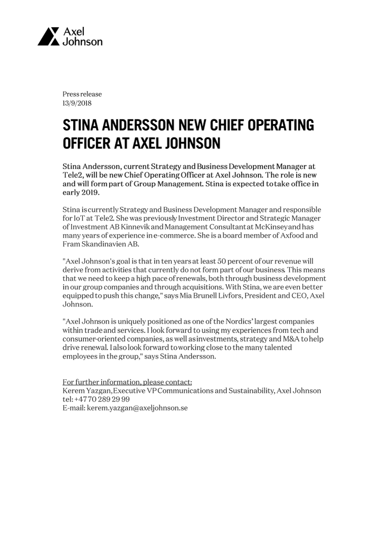 Stina Andersson new Chief Operating Officer at Axel Johnson