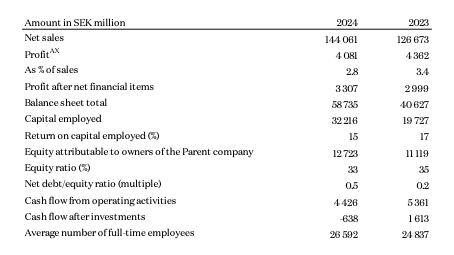 The year 2024 can be summed up as a year of stable results in challenging markets. Sales amounted to SEK 144 (126.7) million and profitAX* to SEK 4.1 (4.4) billion. Our two largest group companies, Axfood and Axel Johnson International, managed to maintain their profit levels from their all-time high results of 2023. While focus was largely on efficiency and cost control, important steps were taken to strengthen market positions, with among other things, the acquisition of the hypermarket chain City Gross and 18 acquisitions within Axel Johnson International.