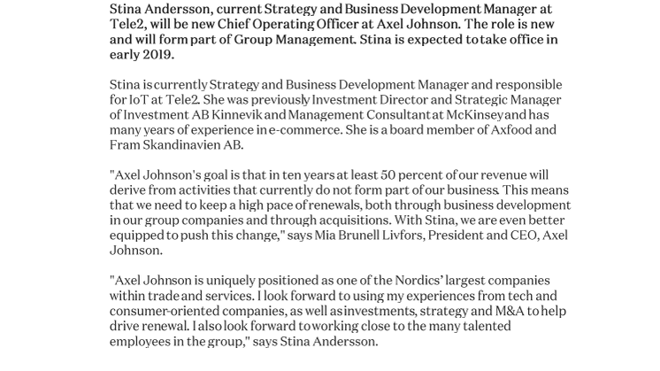 Stina Andersson, current Strategy and Business Development Manager at Tele2, will be new Chief Operating Officer at Axel Johnson. The role is new and will form part of Group Management. Stina is expected to take office in early 2019.