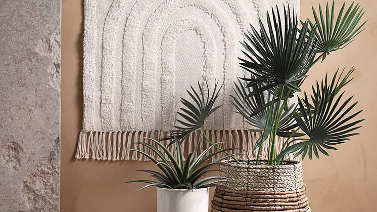 Zemljani smeđi tonovi i TERJE pletena saksija za cvijeće nudi prirodnu, rustikalnu estetiku. Egzotični dojam dodatno je naglašen umjetnom palmom JAKOB koja se savršeno uklapa sa saksijom, dajući zeleni naglasak.