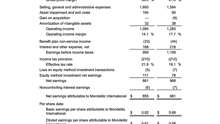 - “Adjusted EPS” is defined as diluted EPS attributable to Mondelēz International from continuing operations excluding the impacts of the items listed in the Adjusted Operating Income definition, as well as losses on debt extinguishment and related expenses; gains or losses on interest rate swaps no longer designated as accounting cashflow hedges due to changed financing and hedging plans; net earnings from divestitures; and initial impacts from enacted tax law changes; and gains or losses on equity method investment transactions. Similarly, within Adjusted EPS, the company’s equity method investment net earnings exclude its proportionate share of its investees’ significant operating and non-operating items. The tax impact of each of the items excluded from the company’s GAAP results was computed based on the facts and tax assumptions associated with each item, and such impacts have also been excluded from Adjusted EPS. The company also evaluates growth in the company’s Adjusted EPS on a constant currency basis.