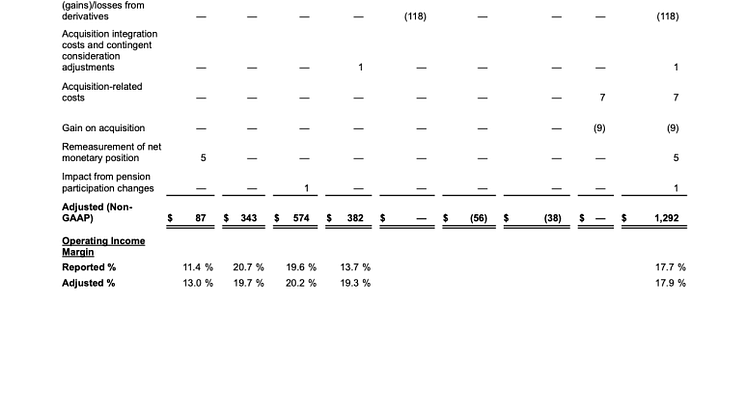 The company uses segment operating income to evaluate segment performance and allocate resources. The company believes it is appropriate to disclose this measure to help investors analyze segment performance and trends. Segment operating income excludes unrealized gains and losses on hedging activities (which are a component of cost of sales), general corporate expenses(which are a component of selling, general and administrative expenses), amortization of intangibles, gains and losses on divestitures and acquisition-related costs (which are a component of selling, general and administrative expenses) in all periods presented. The company excludes these items from segment operating income in order to provide better transparency of its segment operating results. Furthermore, the company centrally manages benefit plan non-service income and interest and other expense, net. Accordingly, the company does not present these items by segment because they are excluded from the segment profitability measure that management reviews.