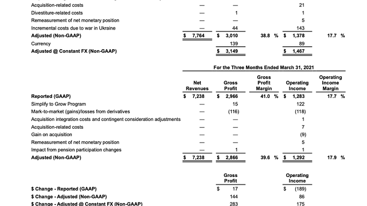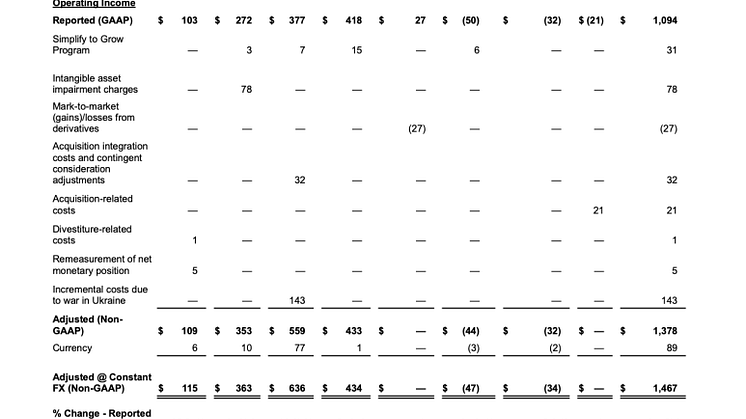 - “Adjusted Gross Profit” is defined as gross profit excluding the impacts of the Simplify to Grow Program;acquisition integration costs; the operating results of divestitures; mark-to-market impacts from commodity, forecasted currency and equity method investment transaction derivative contracts; and incremental costs due to the war in Ukraine. The company also presents “Adjusted Gross Profit margin,” which is subject to the same adjustments as Adjusted Gross Profit. The company also evaluates growth in the company’s Adjusted Gross Profit on a constant currency basis.