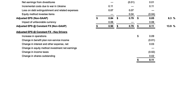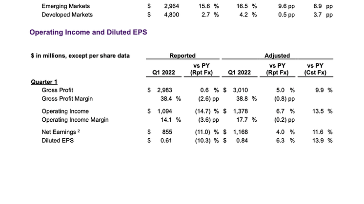 For 2022, the company now expects 4+ percent Organic Net Revenue growth, which reflects the strength of its first quarter and higher pricing related to increased input costs. The company also now expects mid-to-high single digit Adjusted EPS growth on a constant currency basis due to the current estimates of the loss of earnings from the war in Ukraine and material commodity cost increases due primarily to increases in energy costs. The company's Free Cash Flow outlook remains at $3+ billion. The company estimates currency translation would decrease 2022 net revenue growth by approximately 3 percent(3) with a negative $0.17 impact to Adjusted EPS(3).