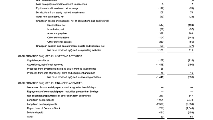 - Cash provided by operating activities was $1.1 billion, an increase of +$0.2 billion versus prior year; Free Cash Flow1 was $1.0 billion, +$0.3 billion