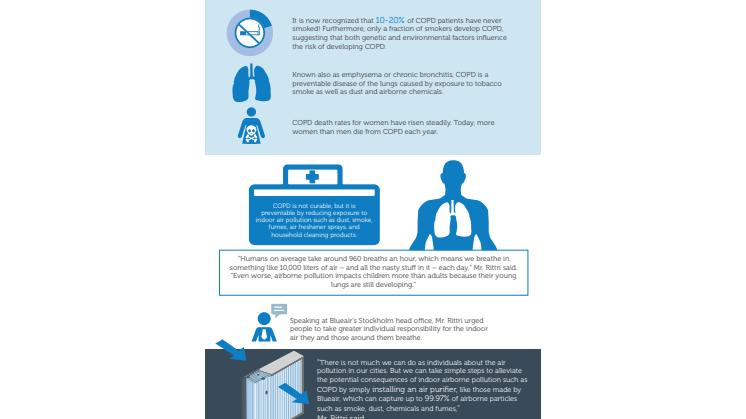 “KOL, även känt som emfysem och kronisk bronkit, är en sjukdom som går att förebygga. Sjukdomen orsakas av att man utsätts för tobaksrök, damm eller luftburna kemikalier”, säger Bengt Rittri, grundare och VD för Blueair, ett svenskt bolag som säljer luftrenare för inomhusbruk i 64 länder över hela världen.