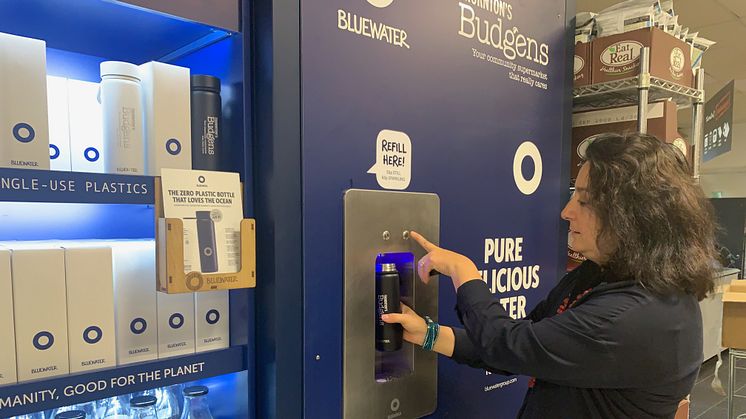 Shoppers at the pioneering Thornton’s Budgens supermarket in north London’s Belsize Park district can now purchase water served still or sparkling direct from an easy-to-use Bluewater station rather than plucking a plastic bottle from a store shelf.