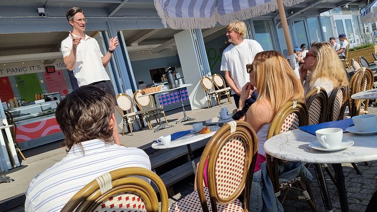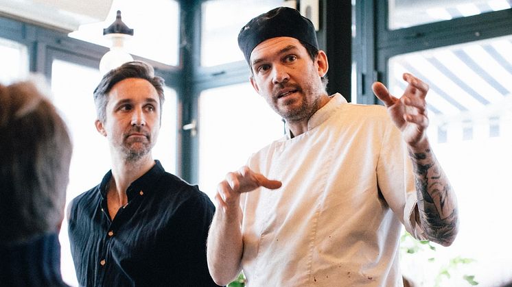 - Bildtext 1: Maximillian Lundin (tv) och Fredrik Ekman (th) i samspråk med journalister på Bluewaters pressträff hos Skeppsbro bageri.