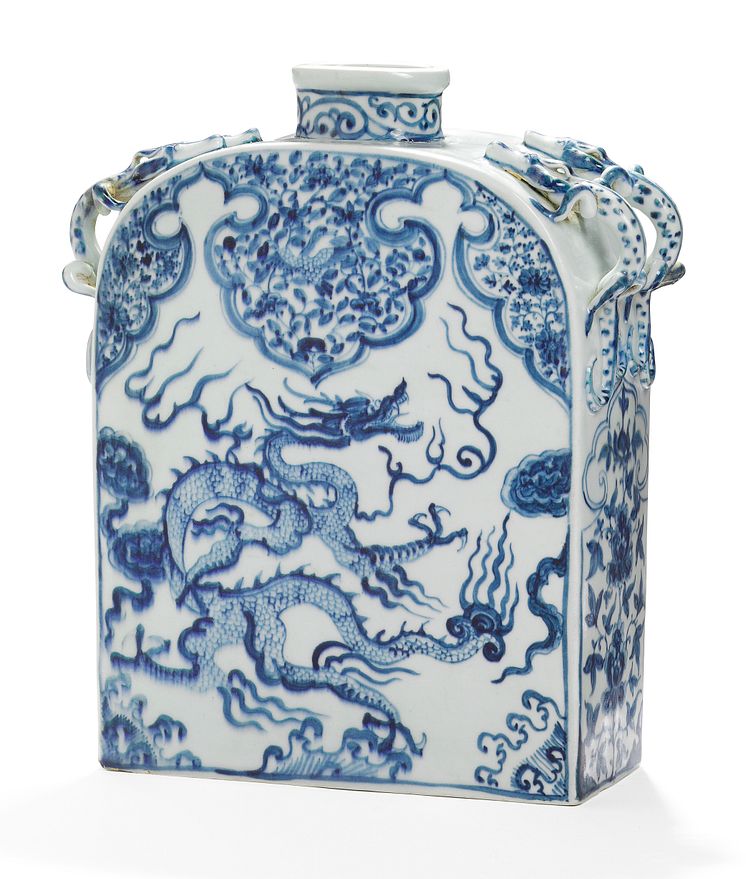 A Chinese porcelain flask decorated in blue, moulded with four dragon handles on the neck and decorated with dragon and design. Yuan 1280-1368. H. 33 cm. Estimate: DKK 1-1.5 million / € 135,000-200,000.