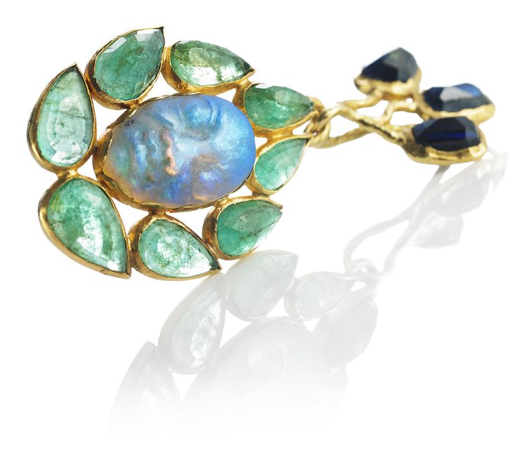 Arje Griegst- Opal-, safir og smaragdvedhæng af 20 kt. guld prydet med udskåret opal i form af ansigt og facetslebne smaragder og safirer
