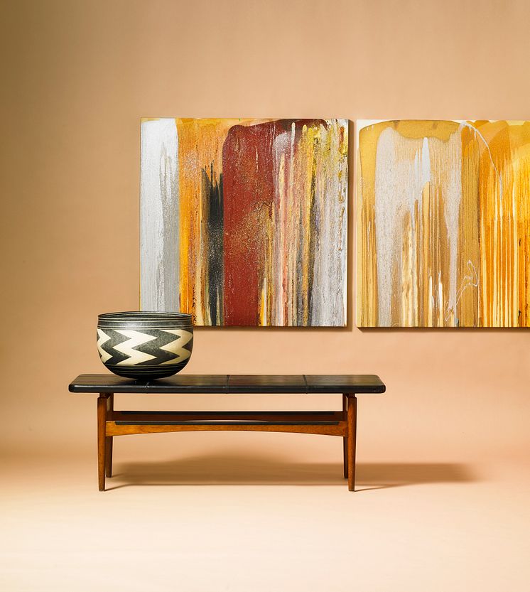 John M. Armleder "Pour Painting" (2002), Alev E. Siesbye stoneware bowl and Svenn Eske Kristensen table bench (1950s)