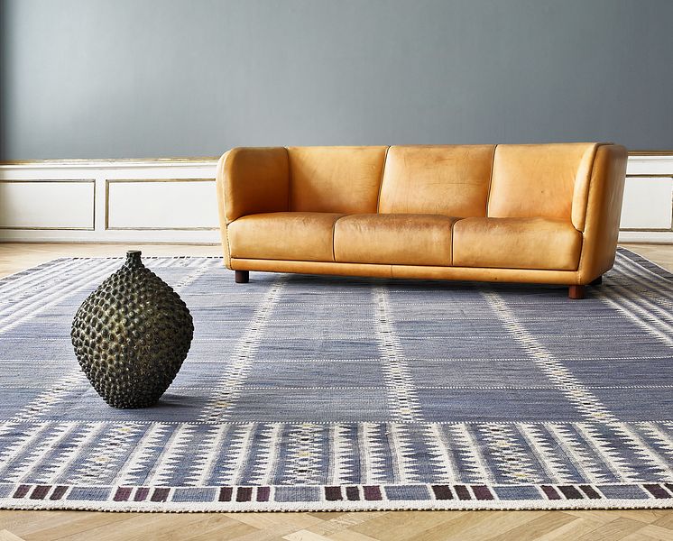 Arne Jacobsen’s unique ”Novo” sofa, Axel Salto’s large stoneware vase and a carpet woven by Barbro Nilsson.