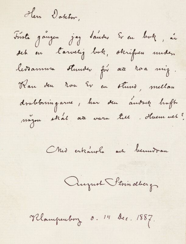 Greeting from August Strindberg. Part of Georg Brandes: Album Amicorum. More than 250 autographs, signed letters and drawings made for the Brandes family, c. 1890–1940. Measurements: c. 15,5 x 22 cm. 397 pages. Estimate: DKK 500,000 / € 67,000.