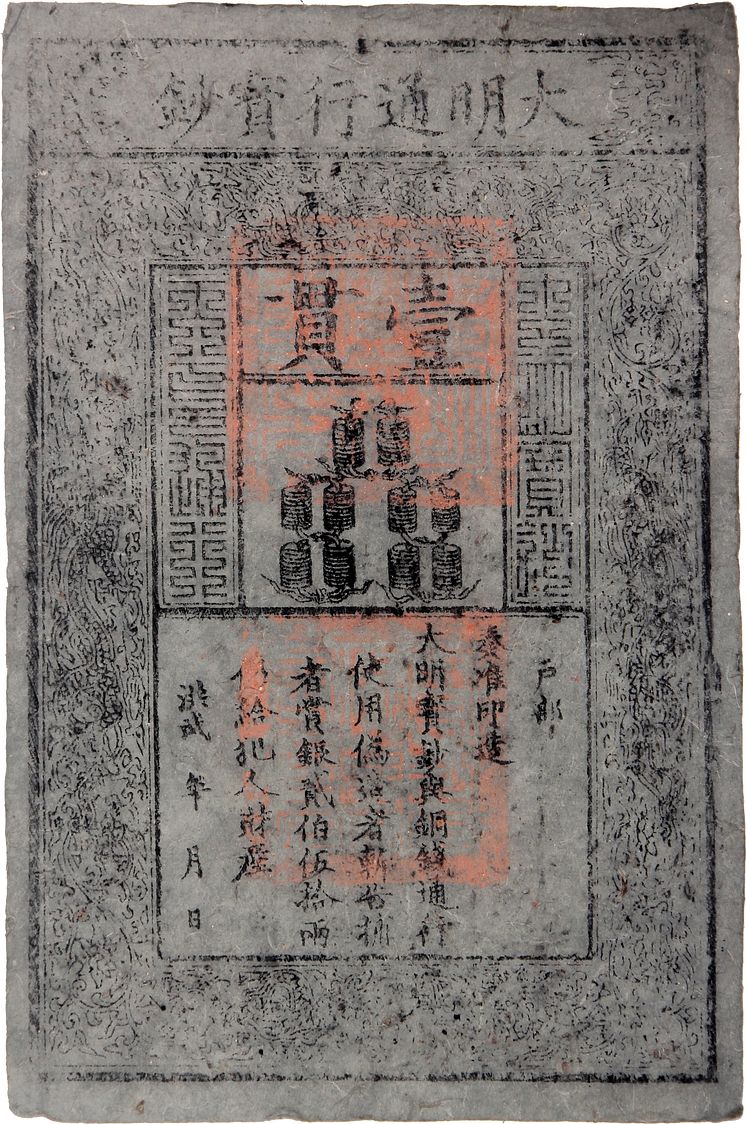 China, Ming Dynasty, Board of Revenue, 1 Kuan (1000 Cash), 1368 - 1399, Pick AA10, printed on mulberry bark paper and stamped with the Red Seal of Emperor Hung Wu. Provenance: The Danish collector and engineer Sophus Black. Estimate: DKK 20,000-25,000 (€ 2,700-3,350)