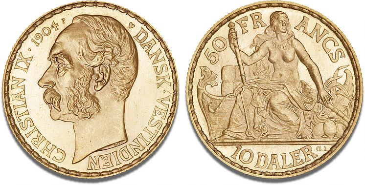Christian IX, 50 francs / 10 daler 1904, H 29, S 5, Sieg 32, F 1, KM 73, ex. Peer Lorentzen, TH 21, lot 1697 (auction 2002) - a legendary piece with mirror surfaces and incredible matte details - a true gem that would easily obtain a technical grade among the very best of this type. Estimate: DKK 70,000 / € 9,400