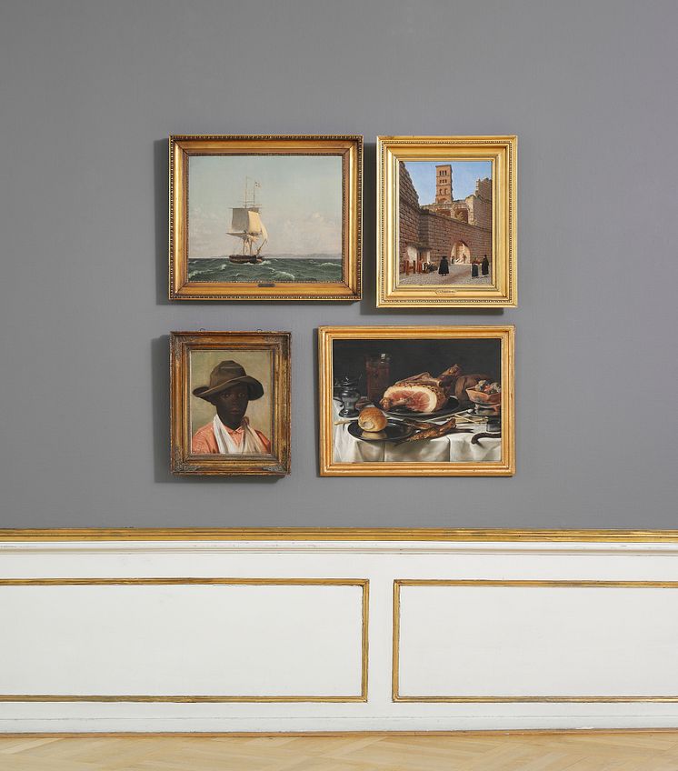 C. W. Eckersberg "The brig Møen" (1823), C. W. Eckersberg Forum of Nerva, Rome (1814), Camille Pissarro Portrait of a boy (1852-1855) and Pieter Claesz Breakfast piece (1625).