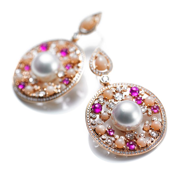 Et par ørestikker af 18 kt. rosaguld hver prydet med talrige safirer, opaler, diamanter og to South Sea kulturperler..
