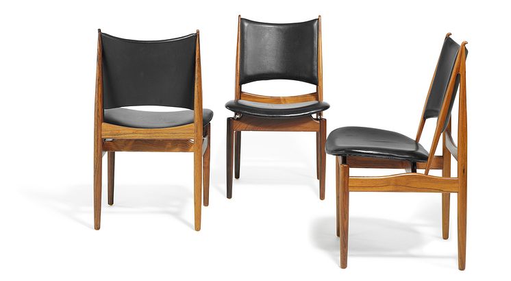 Finn Juhl: "The Egyptian Chair". Rare set of 12 Brazilian rosewood chairs. Seat and back upholstered with black leather. Estimate: DKK 300,000 / € 40,000.