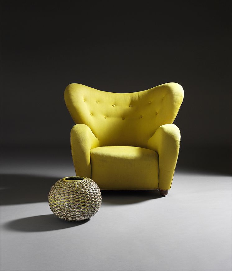 Flemming Lassen: "The Tired Man". Easy chair upholstered with original cover of yellow wool, back fitted with buttons. Mounted on round legs of lacquered mahogany. Designed in 1935. This example was made approx. 1936-1940 by cabinetmaker A.J. Iversen. Estimate: DKK 400,000-600,000. Hammer price: DKK 590,000 (€ 103,000 including buyer's premium).