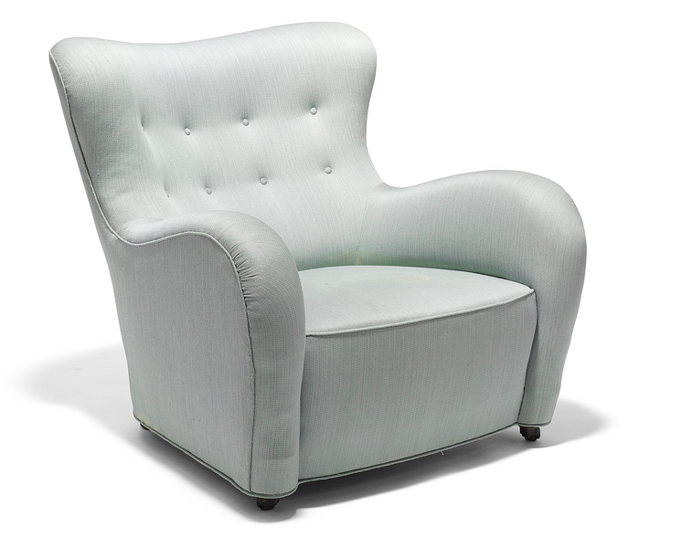 Rare easy chair mounted on beech legs. Sides, seat and back upholstered with light blue wool. Estimate: DKK 200,000.