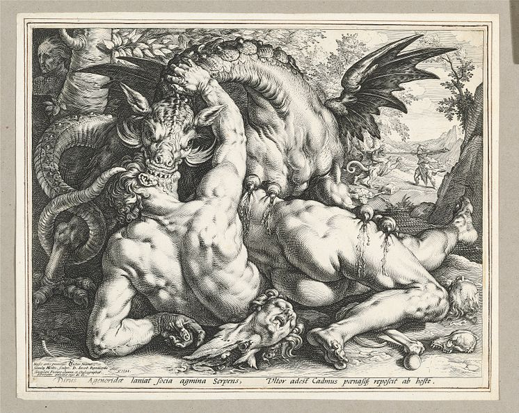 Hendrik Goltzius (after Cornelis Cornelisz van Haarlem): The Dragon Devouring the Companions of Cadmus. 1588. Engraving. Sheet size 252 x 319 mm. Estimate: DKK 30,000-40,000 / € 4,000-5,300