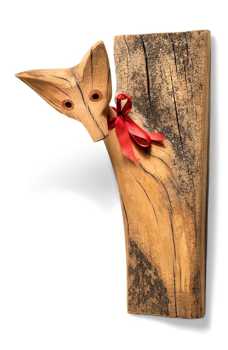 Jacob Hermann: Wall mounted sculpture in the shape of a fox, carved from driftwood in organic shape. Eyes with inlays of mahogany and ebony. Unique. Made 1972 by Jacob Hermann, stamped monogram. H. 34 cm. W. 19 cm. D. 15 cm. Estimate: DKK 10,000 (€ 1,350)