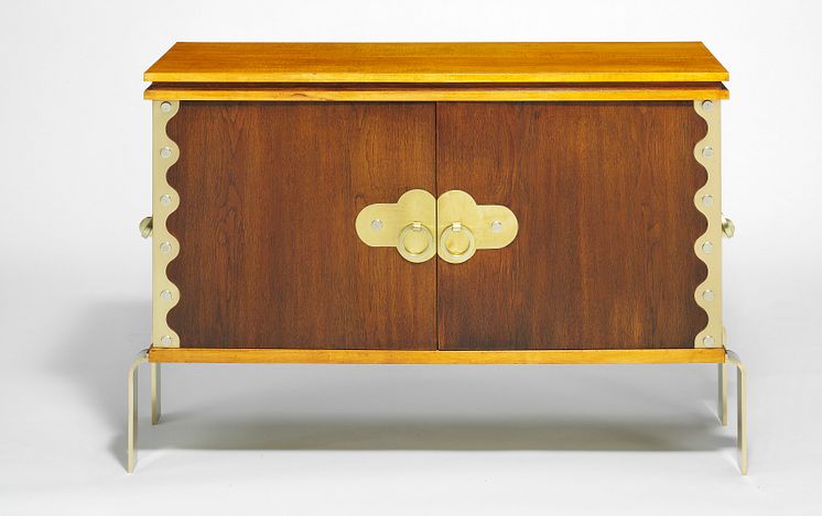 Orla Høyer: A pair of amazing unique low cabinets. Polished oak with top and profile of birch. Bold fittings, handles and curvy legs of brass. Made to order 1941 by Herluf Sørensen. H. 90 cm. D. 54 cm. L. 138 cm. Estimate: DKK 60,000-80,000 / € 8,050-11,000