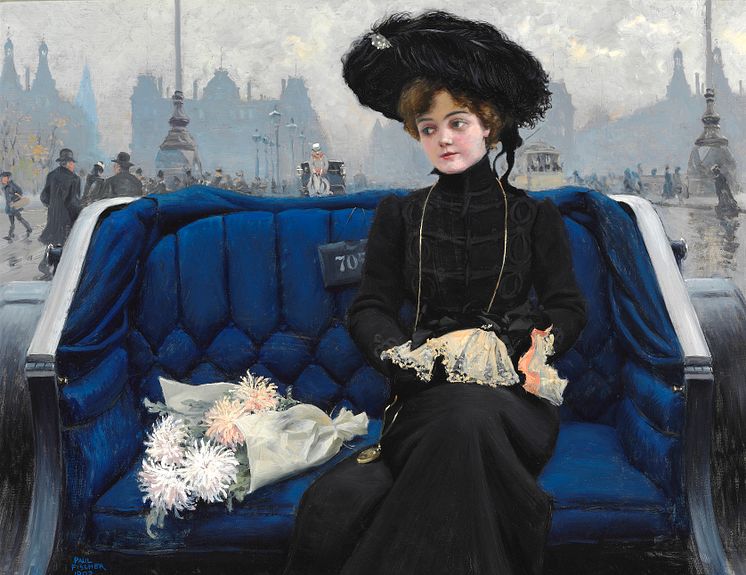 Paul Fischer: Elegant young woman in a horse-drawn cab near Dronning Louises Bro at Søtorvet. Signed and dated Paul Fischer 1902. Oil on canvas. 57 x 75 cm. Hammer price: DKK 750,000 (€ 100,000) (€ 130,000 including buyer's premium)