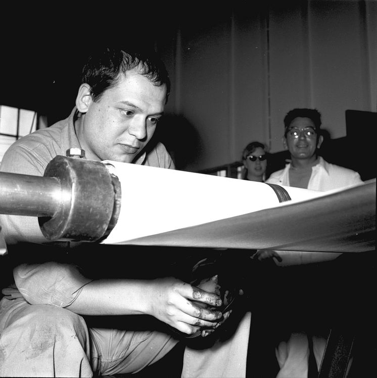 Piero Manzoni creates “Linea Lunga” at the Angli Shirt Factory, in the background you see the Danish artist Paul Gadegaard (Herning 1960-61)