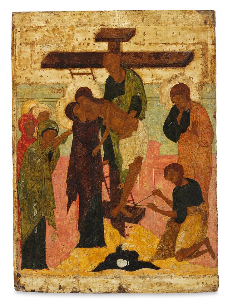 The Novgorod School, 16th century: Large Russian church icon with a depiction of the Descent from the Cross. With kovcheg. Thickness 26 mm H. 90.5 W. 66 Hammer price: DKK 4.6 million (€ 620,000 / € 806,000 including buyer's premium).