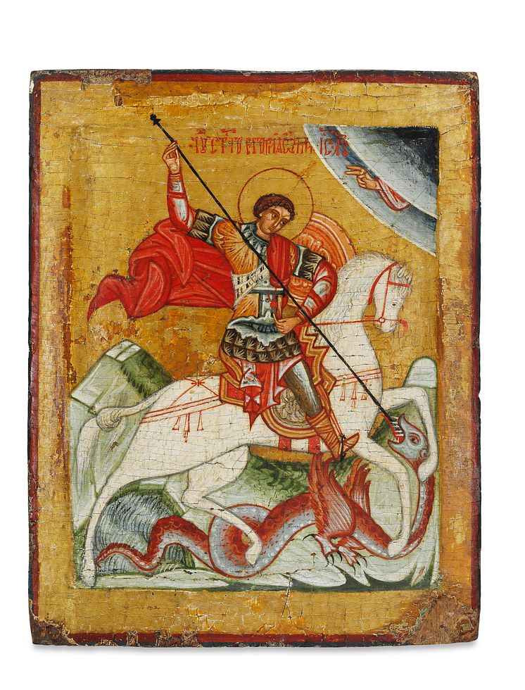 The Novgorod School, 16th century: Russian icon depicting St George and the dragon. Tempera on wood with a kovcheg. 30 x 23.5 Hammer price: DKK 2.2 million (€ 296,000 / € 385,000 including buyer's premium).