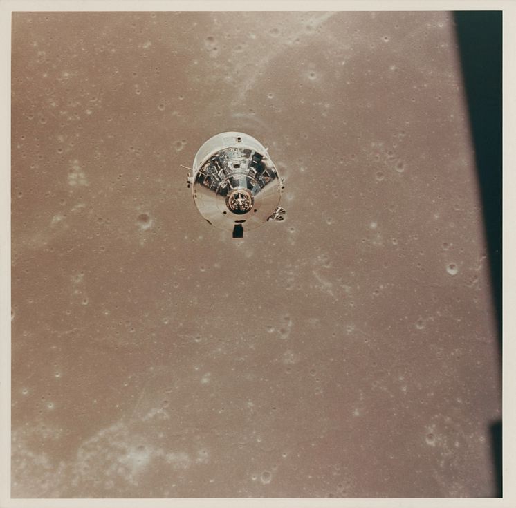 The CSM Columbia over the Sea of Fertility, as seen from the LM descending to the lunar surface.jpg