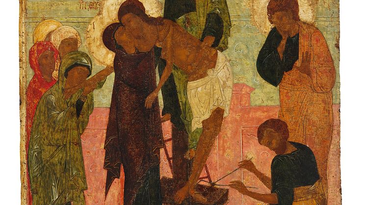 Russian church icon with a depiction of the Descent from the Cross.