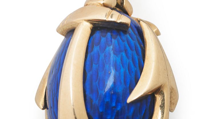 • August Holmström: A Russian Easter egg pendant with blue translucent enamel on guilloched ground, set with anchor formed 14k gold cagework.