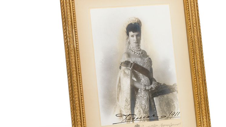 • Alfred Pasetti: Portrait of Tsartisa Maria Feodorovna in Russian Court dress, with her Danish autograph "Dagmar 1911". Sheet size c. 18.5 x 13.5 cm.