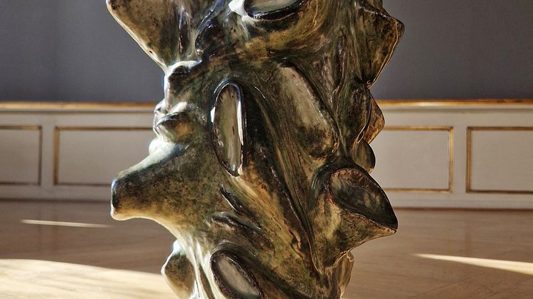 • Axel Salto- Sjældent udbudt vase af stentøj modelleret med stiliserede frugter og blade i relief. H. 36,5. Diam. maks. 27