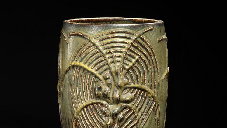 • Axel Salto- Sjældent udbudt vase af stentøj modelleret med stiliserede frugter og blade i relief. H. 36,5. Diam. maks. 27.